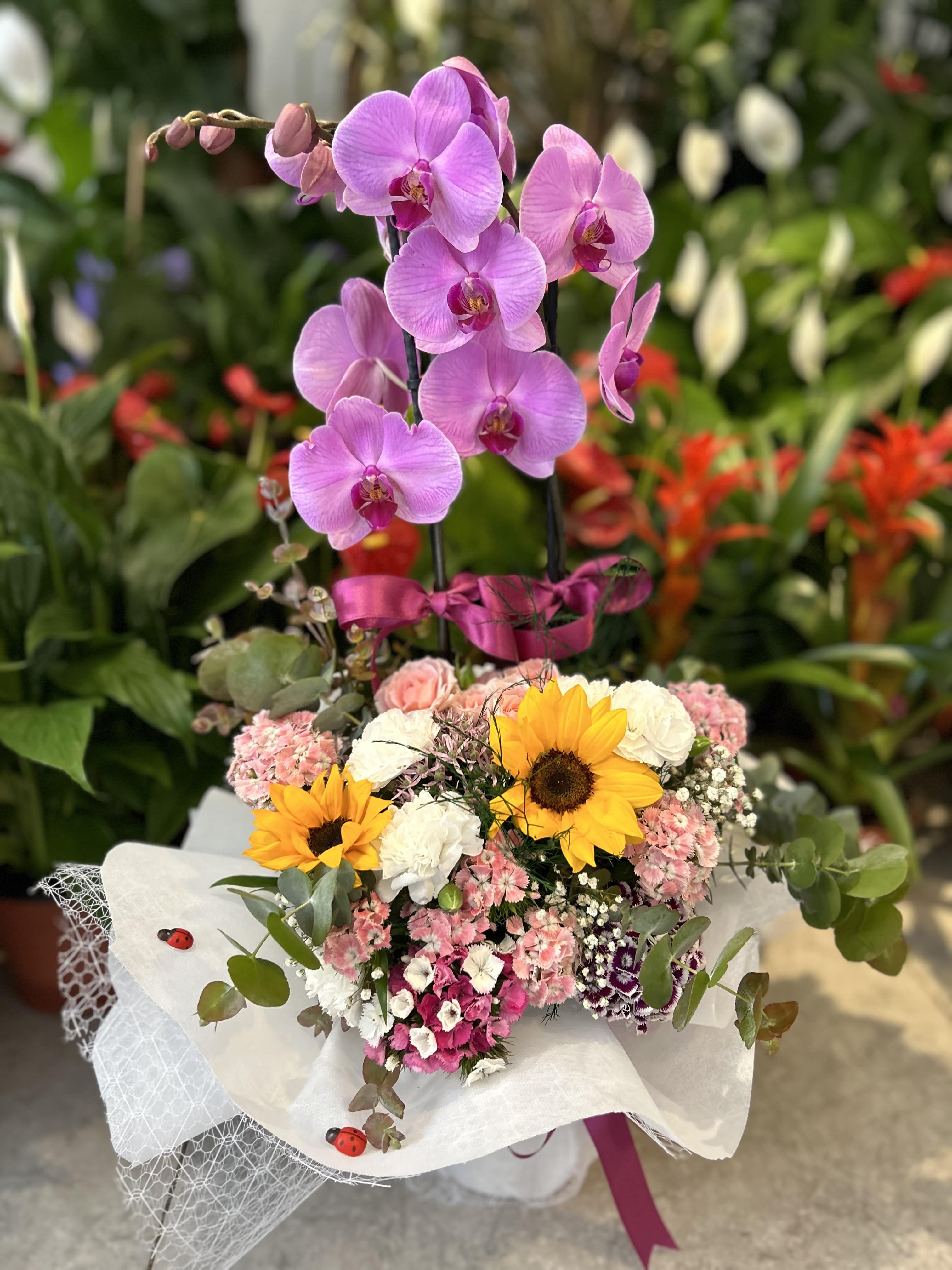 Ürünümüz özel butik süsleme orkide ve canlı mevsim çiçekleri ve 1.sınıf süsleme malzemeleri kullanılarak hazırlanır.. Özel günlerde tercih edebilirsiniz. Ürünler stok durumuna bağlı olarak görüntüden taviz vermeden hazırlanır.